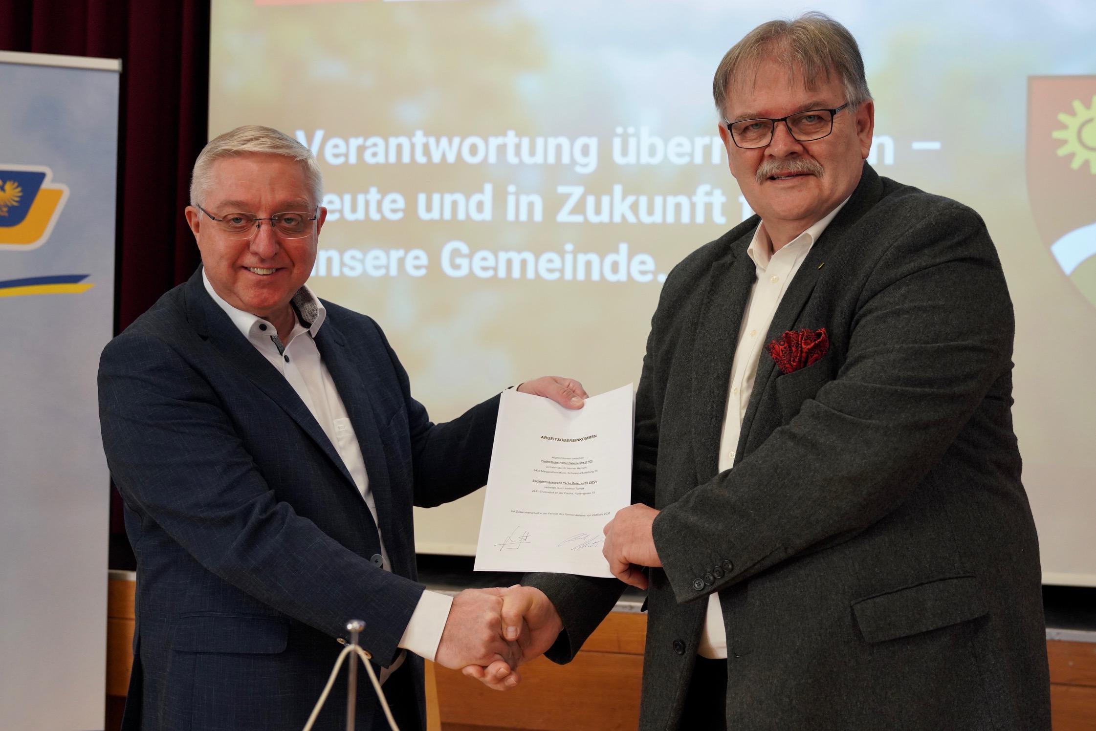 „Wir setzen in unserer Zusammenarbeit auf Ehrlichkeit, Tatkraft und Bürgernähe. Es geht um mehr Lebensqualität, Versorgungssicherheit und um eine Politik auf Augenhöhe mit der Bevölkerung und für die Bevölkerung“, betont der designierte FPÖ-Bürgermeister der Marktgemeinde Enzersdorf an der Fischa, NAbg. Werner Herbert am heutigen Donnerstag im Rahmen der gemeinsamen Pressekonferenz mit dem designierten SPÖ-Vizebürgermeister Helmut Tomek im Volksheim. FPÖ und SPÖ haben heute das Arbeitsübereinkommen bis 2030 unterzeichnet. Das gemeinsame Motto lautet: Verantwortung übernehmen. Heute und in Zukunft für unsere Gemeinde. „Es werden gute Jahre für Enzersdorf an der Fischa“, betont Herbert, der auf eine respektvolle, wertschätzende und lösungsorientierte Zusammenarbeit setzt.