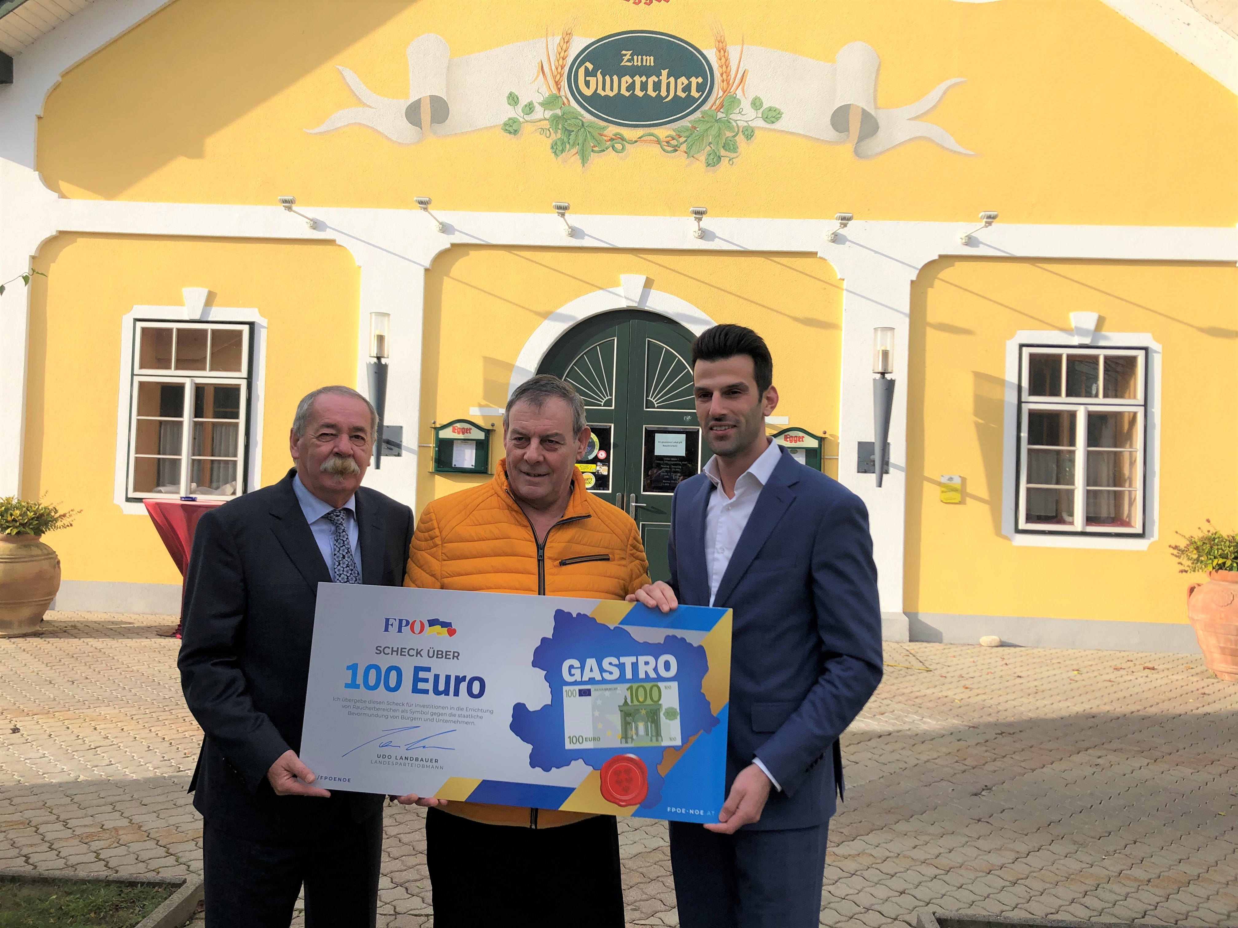 Wie versprochen ist FPÖ-Landespartei- und Klubobmann Udo Landbauer in ganz Niederösterreich unterwegs und unterstützt die Gastronomen bei der Errichtung von Raucherbereichen außerhalb von Lokalen und Investitionen in Heizstrahler oder Raucherzelte „Die Nachfrage ist gewaltig, was zeigt, dass die Wirte vom radikalen Rauchverbot – in ihren eigenen Lokalen – massiv betroffen sind“, sagt Landbauer. Am Freitag, den 29. November ging es für den freiheitlichen Landesparteiobmann in das traditionelle Wirtshaus Zum Gwercher. Gemeinsam mit FPÖ-Bezirksparteiobmann LAbg. Erich Königsberger erfolgte die Übergabe des Gastro-100er. „Ich bedanke mich für den herzlichen Empfang und die Gastfreundschaft. Das Wirtshaus Zum Gwercher ist ein echter Vorzeigebetrieb für unser Land– gemütlich und bodenständig, einfach Niederösterreich! Der „Gwercher“ hat sich die Unterstützung redlich verdient“, so Landbauer.