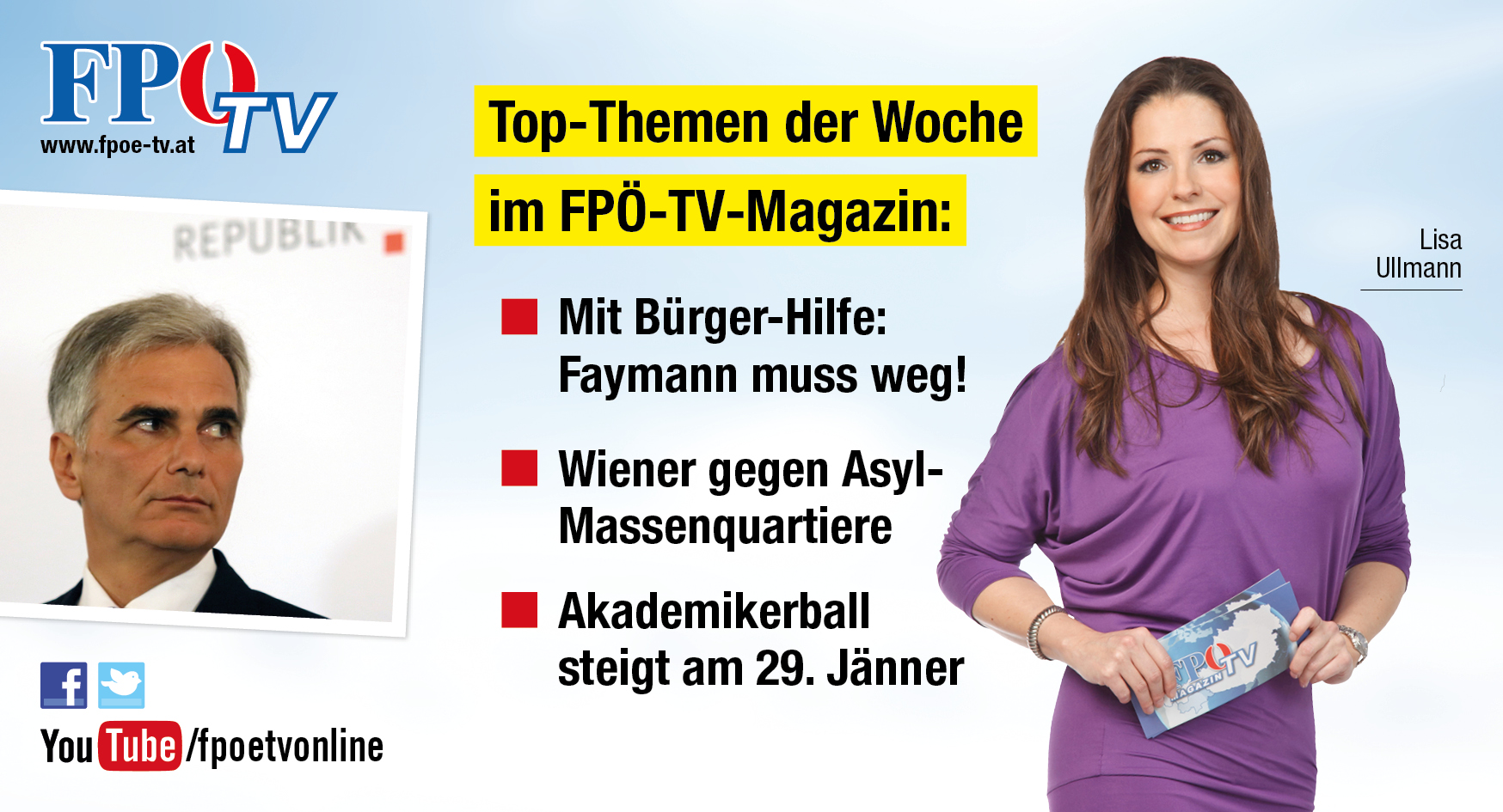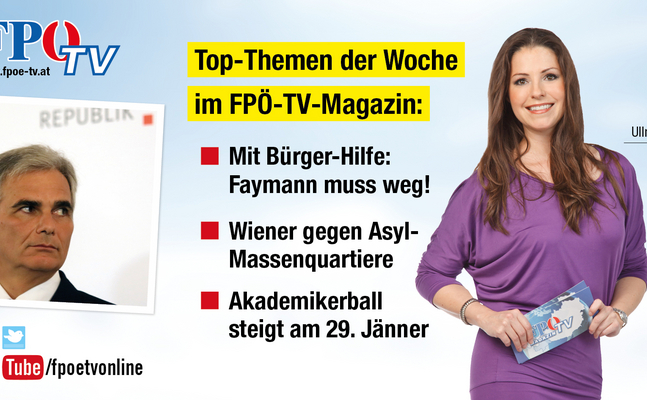 Das FPÖ-TV-Magazin erscheint immer donnerstags pünktlich um 11 Uhr auf http://www.fpoe-tv.at und im YouTube-Kanal http://www.youtube.com/fpoetvonline.