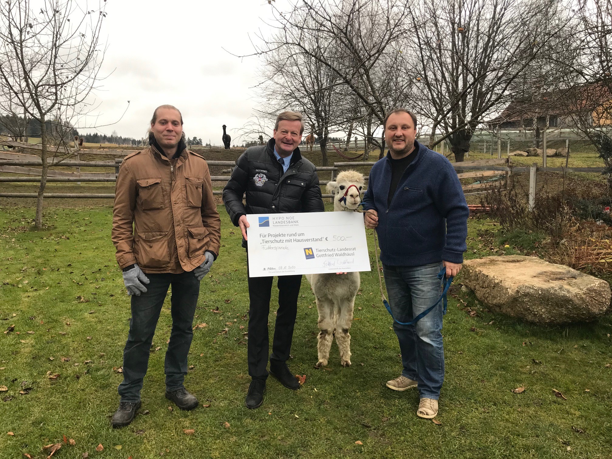 Nur noch wenige Wochen ist Alpaka-Männchen Lorenzo der offizielle NÖ Tierschützling des Jahres 2020, als Abschlussgeschenk bzw. als vorweihnachtlichen Gruß brachte Tierschutz-Landesrat Gottfried Waldhäusl nun eine Futterspende am Sonnseitnhof in Bad Großpertholz vorbei. „Lorenzo hat sich sowohl den Titel als auch die jetzige Extraportion an Futter redlich verdient, schließlich hat er auf der Kinderburg Rappottenstein als Therapietier hervorragende Dienste geleistet.“